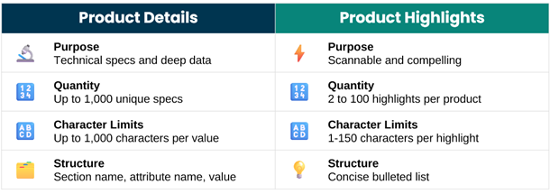 Selling products with technical specs or unique differentiators? The product_detail attribute is your secret weapon. This underutilized field allows up to 1,000 unique specifications per product, each with: