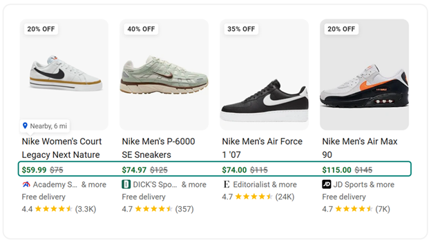 As consumer expectations have evolved, driven in large part by marketplaces like Amazon, free and fast shipping is no longer a differentiator in many verticals. It’s an expectation. While shipping annotations don’t always reflect a direct price reduction the way sale pricing or promotions do, they influence perceived total cost and delivery convenience, both of which materially impact click-through and conversion behavior.
